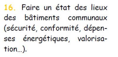 Faire un état des lieux des bâtiments communaux (sécurité, conformité, dépenses énergétiques, valorisation…).