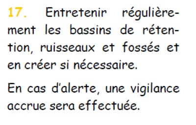 17 - Cet entretien a été fait, Certains petits travaux ont été réalisés et notamment du côté de l'Avenue de la Mer, en face du chemin du Pétrole. Mais a-t-on prévenu les particuliers et contrôlé que les fossés leur appartenant ont été entretenus en vue d'un écoulement normal en cas de grosse pluie ? Concernant la vigilance, celle-ci ne peut être exercée qu'avant une alerte. La sécurité, c'est avant l'accident pas quand il est annoncé. Et comme on ne peut pas tout prévoir...