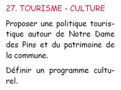 27 - Ce n'est encore pas le rôle de la commune, une association propose déjà un programme culturel autour de l'église et elle est dans son rôle. Pour ce qui est de la politique touristique je n'ai rien vu de nouveau, ni d'ailleurs plus de touristes. A quoi servirait un afflux au niveau de la commune ? Il n'y a pas Disneyland à Espondeilhan pour ouvrir de nouveaux commerces ! Espondeilhan est à la campagne et je préfère qu'elle reste telle.