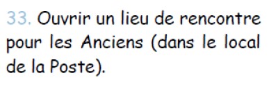 Ouvrir un lieu de rencontre pour les Anciens (dans le local de la Poste).