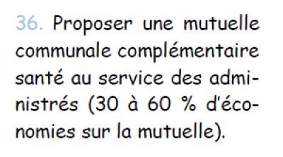 ![]() | 36 - Une mutuelle n'a rien de communal. Il existe sans doute plus de contrats et d'options que pour des abonnements de téléphonie mobile ou fixe. S'avancer à annoncer une économie de 30 % et plus relève de la prestidigitation. En fait il aurait fallut dire par exemple : 'nous allons nous assurer de trouver un service de conseil de confiance pour trouver les meilleures offres de mutuelles selon vos options'. Selon quels critères la commune a-t-elle choisi un courtier en assurance. Si l'idée est bonne, elle ne mérite pas autant de publicité d'autant plus que la fourchette annoncée va jusqu'à 60 %, c'est très fort. Il n'existe aucune statistique du nombre de souscriptions et du gain sur les coûts. J'ai même entendu parler d'un cas négatif après souscription... | N/A |