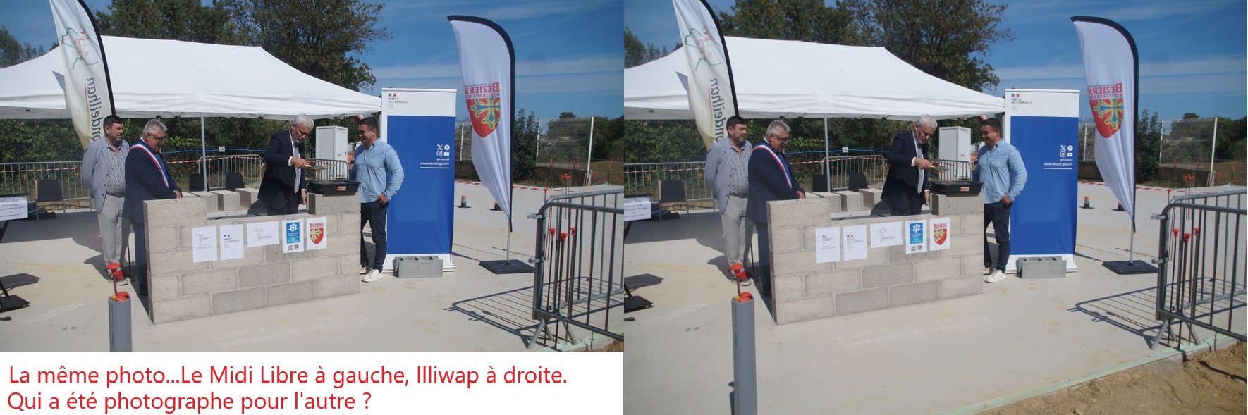 Mais d'autres phénomènes sont plus que gênants, ils atteignent notre démocratie. Des photos ont été prises lors de la pose de la première pierre de l'école. Le journal et / ou le site internet du Midi Libre en a publié 5 et sur le site Illiwap de la commune on en retrouve 10, dont 5 qui sont rigoureusement les mêmes. Ceci signifie tout simplement que la commune a transmis les photos au Midi-Libre ou inversement (l'article du Midi Libre). Il y a eu récemment une affaire nationale qui a mis l'accent sur les relations entre le monde politique et la Presse ou la Télévision et ici nous sommes dans le même registre, certes a une autre échelle mais tout autant toxique. Souvenez-vous de l'affaire Thomas Legrand de début septembre 2025. N'oublions pas que la personne qui représente la 'COM' à Espondeilhan est aussi une ancienne correspondante du Midi Libre. Si vous avez encore quelques doutes sur les relations entre le monde politique et certains groupes de presse, de radio ou de télévision, j'espère vous avoir convaincu. Là, la question est encore aggravée par le fait que la 'COM' espondeilhanaise exerce hors du contrôle des élus. il s'agit de quelqu'un de déclaré, mais non désigné officiellement par le conseil municipal et qui travaille donc surtout pour l'image du maire, nous en avons eu des preuves.