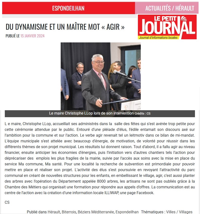 Je viens de trouver un peu par hasard un article du Petit Journal du 15/01/2024 qui parle d'AGIR. Il est bien sûr à mettre en illustration à tout ce que je viens de décrire et ce n'est pas le début. Là nous étions non pas à mi-mandat comme annoncé, mais aux 2/3 ! Une fois de plus, la 'COM' a été le moteur. Les élections arrivent et il faut donc embellir non seulement le village, mais allouer à l'équipe municipale des réalisations qui sont plus nuancées, bien sûr toutes ne sont pas dans ce cas, heureusement. Regardez mon tableau du 24/01/2025, il parle par exemple des finances. Le bilan, c'est pour bientôt et cela risque de surprendre.