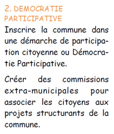 ![]() | 2 - Echec total ! Un flop ! La 'commission' devait être votée au conseil municipal, or il n'en a rien été. Une commission doit être votée en même temps que la liste des élus (ou des habitants) qui la composent, ce ne fut pas le cas. Elle est donc illégale. Pour s'en convaincre, il suffit de lire le règlement intérieur sur le site internet de la commune, dans conseils municipaux. La sélection des membres s'est effectuée très arbitrairement sur des critères qui relèvent d'une inégalité totale. Comment peut-on oser appeler cela de la démocratie d'abord et lui adjoindre l'idée participative ? 1,5% de citoyens seulement y participent, aux autres, personne ne leur a demandé s'ils étaient intéressés. | 0 % |