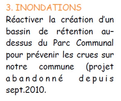 ![]() | 3 - La Gestion des Milieux Aquatiques et la Prévention des Inondations (GEMAPI) est une compétence obligatoire de l'Agglo depuis le 01/01/2018. Ceci n'empêche pas les communes d'avoir des accords avec leur communauté de commune (ou les termes d'Agglo, EPCI, Communautés de communes, communautés d'agglomération, communautés urbaines et métropoles). Ce bassin de rétention, donc celui au-dessus du Parc Communal, n'est à priori pas encore réalisé par manque de terrain pour le mettre en place. Des tractations seraient en cours pour un achat communautaire et une réalisation imminente, le propriétaire du terrain serait maintenant d'accord pour vendre. Ce projet existait avant l'arrivée de 'AUTREMENT' aux commandes communales en 2020. On ne peut promettre que ce que l'on maîtrise. Promesse non considérée car c'est le rôle de l'Agglo (N/A, non applicable à la commune). | N/A |