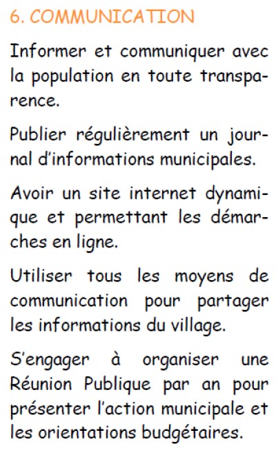 ![]() | 6 - Pour la transparence, je crois qu'il faudra revoir totalement la copie... Une preuve ? Nous sommes dans la confusion entre les communications sur l'administration de la commune et ce qui est accessoire et qui concerne plutôt les fêtes et loisirs. Le sujet ici est la gestion communale. Mais que savons-nous des tractations d'avant contrats passés pour l'avenue de la Tuilerie, la ZAC EST (Les Cocales) avec la Sarl Aménagement d'Occitanie (le soi disant Crédit Agricole), la ZAC OUEST avec TERRA NOSTRA suivi de la SAS Les Ecoliers ? Pour ces sujets majeurs qui vont avoir une influence très forte sur la vie dans notre village nous ne savons rien. Parfois même, les élus du groupe qui n'ont pas travaillé sur ces questions, n'ont pas eu connaissance de certains faits, qui auraient pu changer leurs votes... C'est plutôt grave, non ? Il y a une différence entre communiquer et être transparent, et le fait de faire de la propagande et du mensonge ! Il y a trop de points négatifs sur des sujets d'importance haute. | 40 % |
