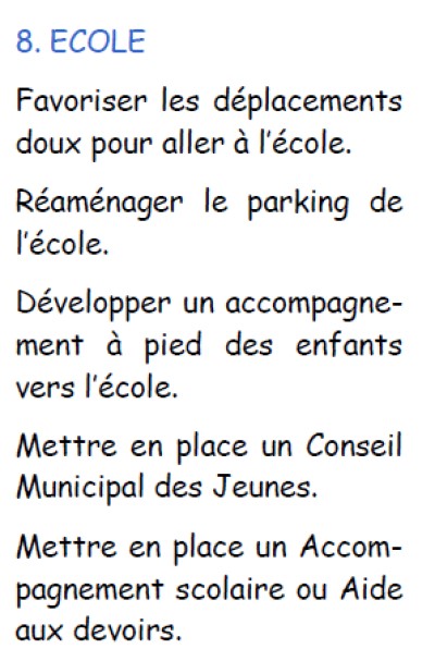 ![]() | 8 - Le déplacement doux est au programme, mais il nécessite selon les informations données un investissement de 580 000 € pour les travaux de parking de l’école et l'aménagement du cheminement doux chemin du Pétrole. | 20 % |