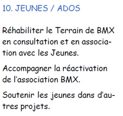 ![]() | 10 - Il me semble qu'il n'y a plus d'association de ce type à Espondeilhan. Cela ne signifie pas que des jeunes n'ont pas envie de pratiquer ce sport ou le VTT. Un circuit à bosses et en boucle a été crée à côté du City-park. Accompagner la réactivation de l'association qui n'existe plus n'est pas le rôle de la commune. Mais que signifie 'accompagner', s'occuper de leurs affaires ? Les jeunes savent créer et gérer une association. Ils ont sans doute plus besoin d'équipements et c'est là le rôle d'une commune. S'il y a de vrais adeptes, je ne pense pas que ce qui a été mis en oeuvre, le pumptrack, corresponde vraiment à leurs attentes. Il y manque une surface moins friable et donc plus sécurisée. Il y a quelques photos sur ce site, vous comprendrez mieux. | 75 % |